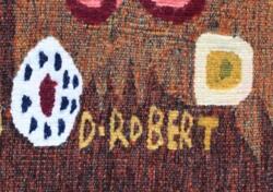 En fait, il s'agit encore une fois d'un tissage non autorisé d'aprés un carton de Dom Robert, connu, en version réduite / à l'original, de très mauvaise facture, sans respect des formes, de la coloration, sans signature d'atelier, signature Dom Robert non conforme …